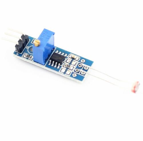 Compact light sensor module with onboard photoresistor, with three pins for 5V power supply, TTL electrical level (or SCM) and GND power respectively.
